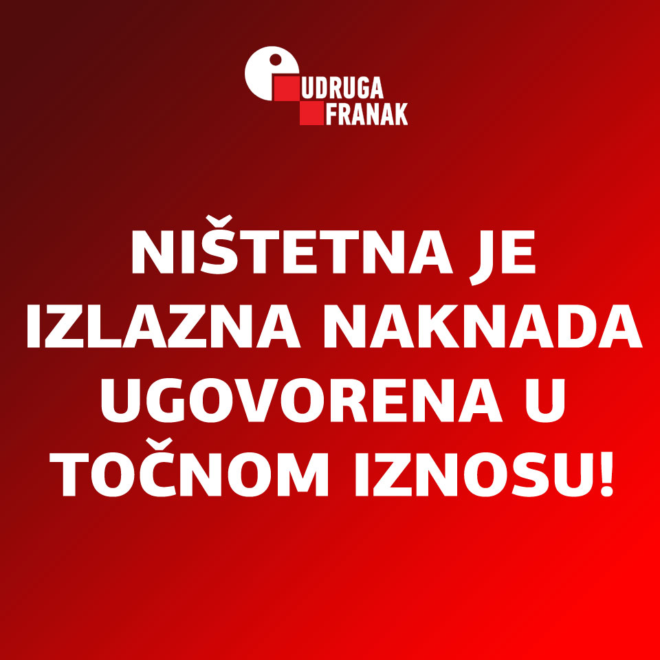IZLAZNA NAKNADA UGOVORENA U TOČNOM IZNOSU NIŠTETNA JE, BANKA NEMA PRAVO UNAPRIJED UGOVARATI ŠTETU, NITI IMA PRAVO UGOVARATI IZLAZNU NAKNADU BEZ SPECIFICIRANOG KONKRETNOG TROŠKA!